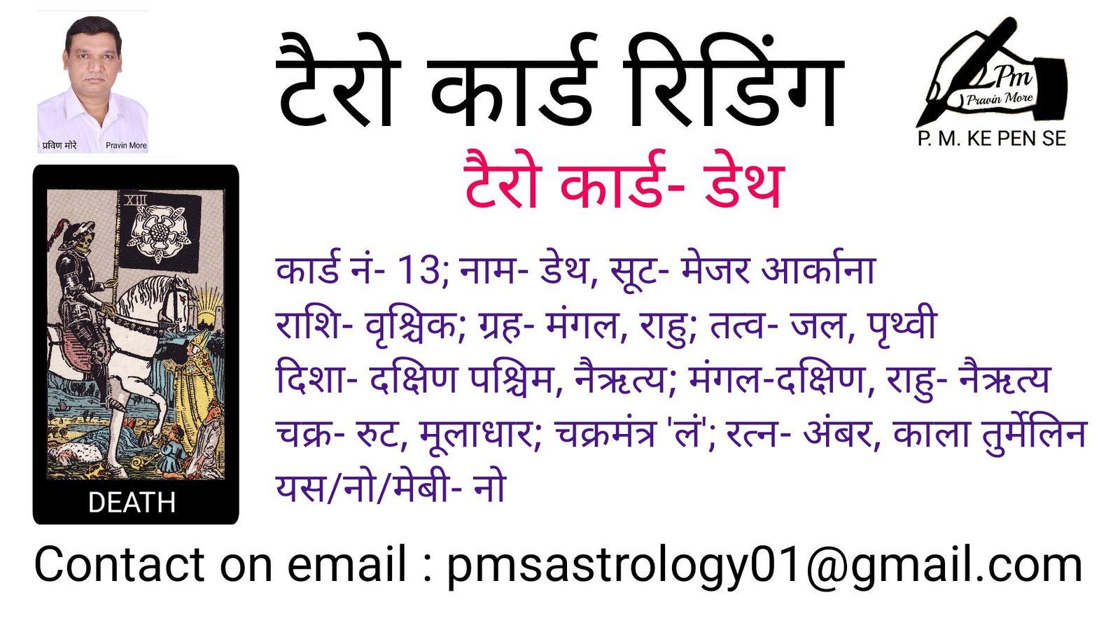 इस कार्ड के आने पर मृत्यु की संभावना होती हैं। जो काम कर रहे हैं, उसे खत्म करके या उसे बंद करके नया काम करना पड़ता हैं। जीवन में परिवर्तन आता हैं। जीवन में कुछ चीजें नष्ट हो सकती हैं। कोई अपना दूर जा सकता हैं। जो मोहमाया में बंधे हैं, उनको मुक्ति मिल सकती हैं।